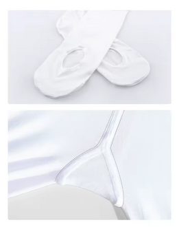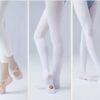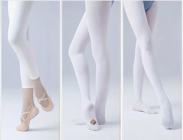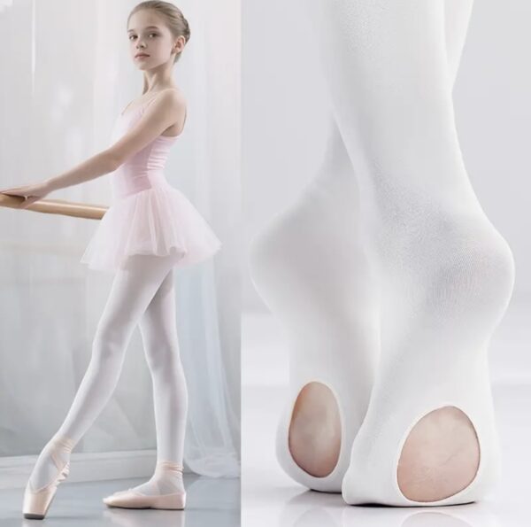 Елегантен и функционален бял балетен чорапогащник с отвор на стъпалото, създаден специално за балет, танци и художествена гимнастика. Отворът позволява лесно преминаване от чорапогащник към босо стъпало или палци, без да се налага събличане.